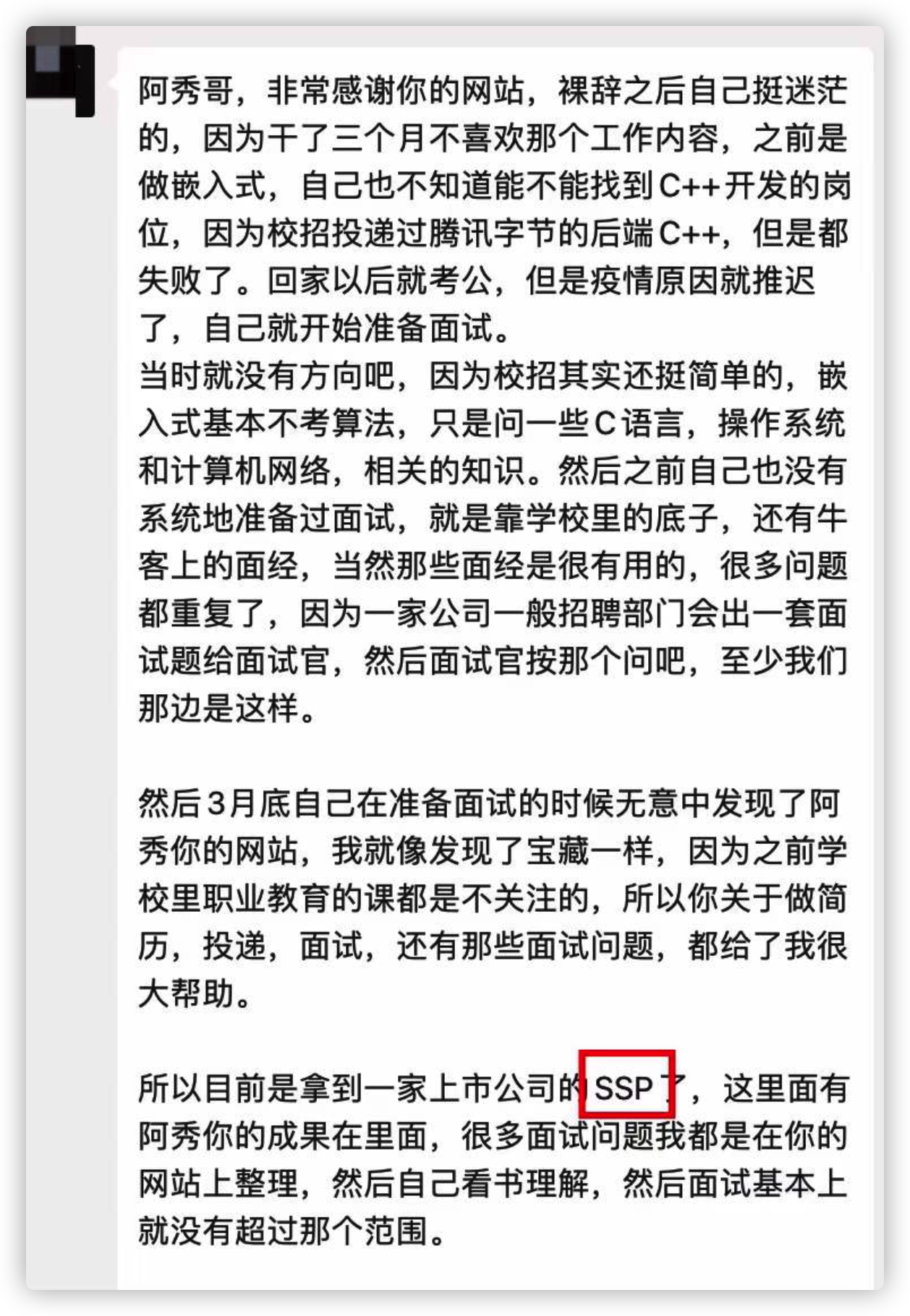 我觉得你的网站上的内容和经验之类的比学校里老师教的强多了,如果早点知道你的网站并且加以运用,我肯定能在校招中像你一样拿个SP了。