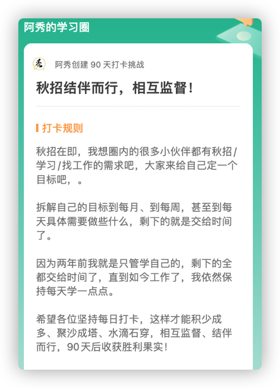 最近阿秀在自己的学习圈子 (opens new window)里发起了一项秋招结伴而行、相互监督的活动。
