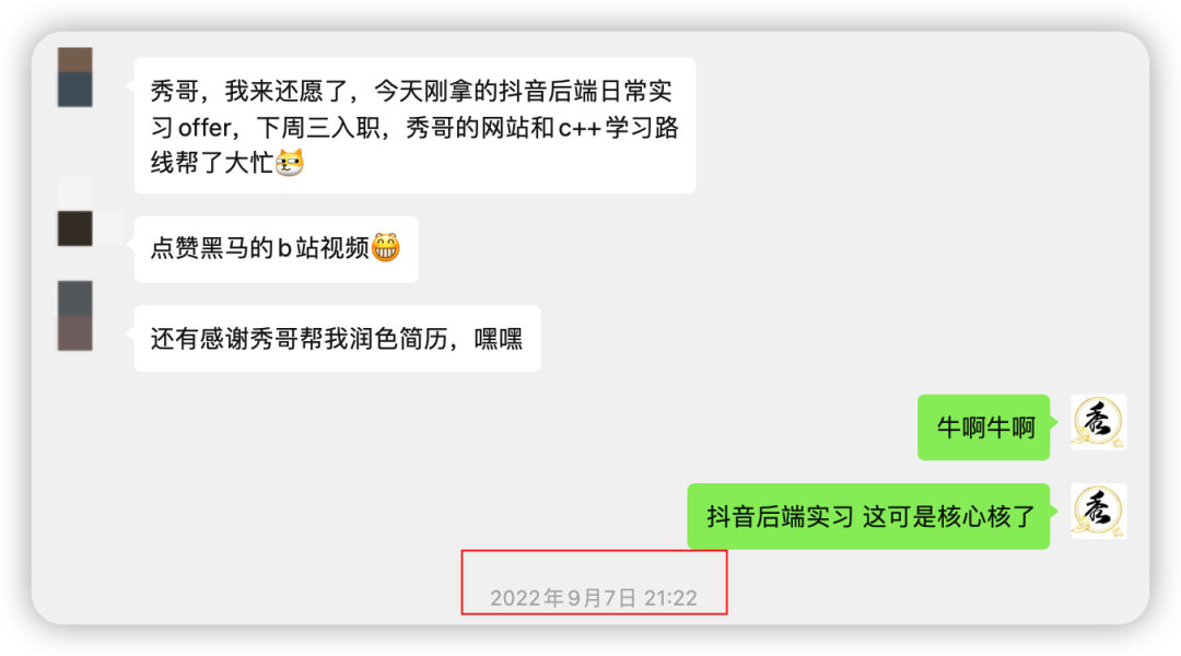 后来9.7号那天晚上跟阿秀微信私聊说前顺利上岸了抖音后端日常实习,offer已经审批下来了,过段时间就去入职。