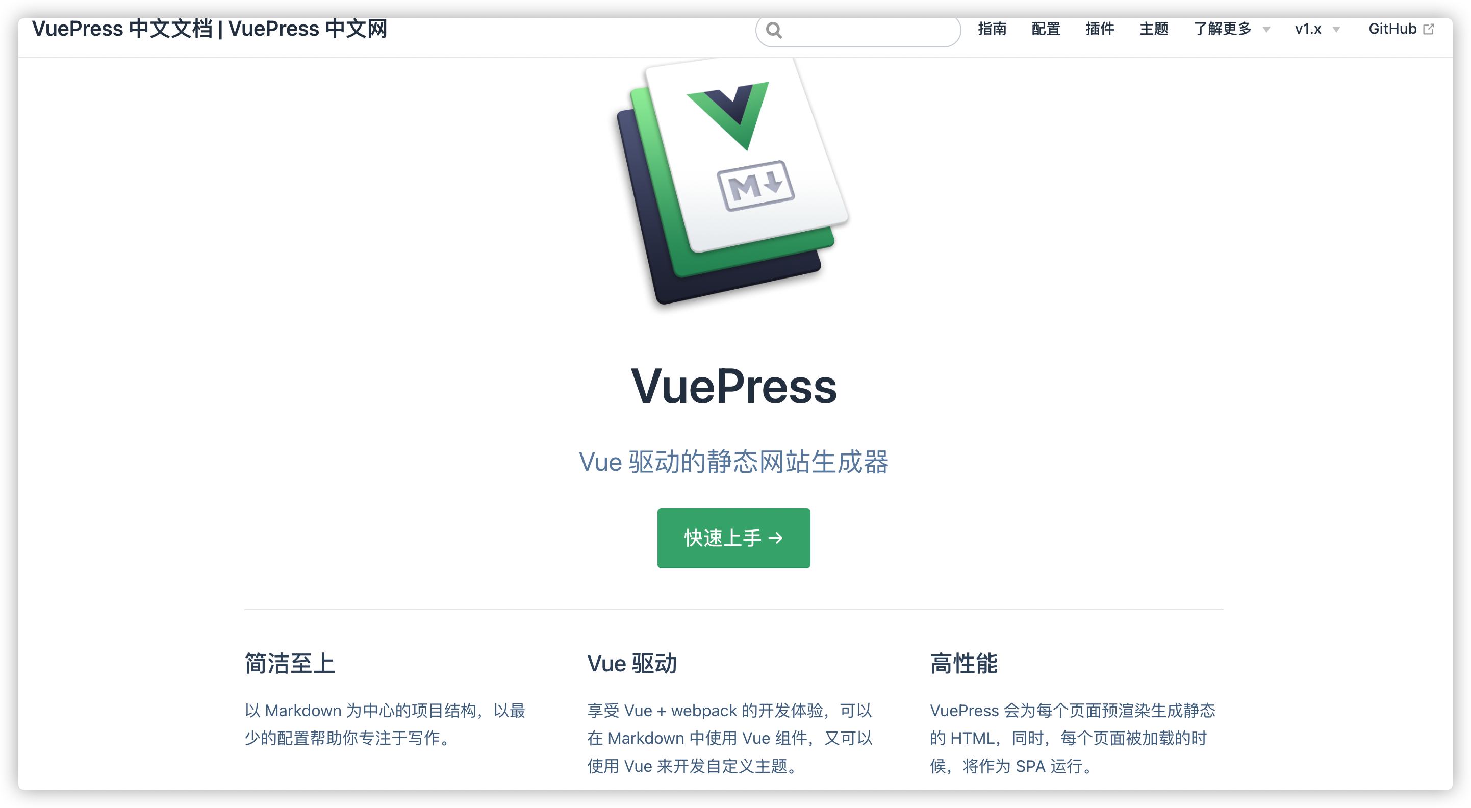 - 高性能:VuePress 会为每个页面预渲染生成静态的 HTML,同时,每个页面被加载的时候,将作为 SPA 运行。